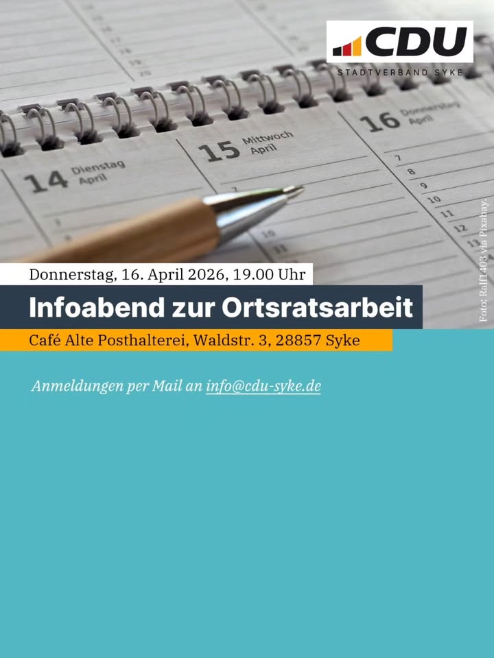 Der CDU-Stadtverband Syke heißt Sie auf seiner Webseite herzlich willkommen! Hier informieren wir Sie über Meldungen aus dem Stadtverband, aktuelle Themen aus der Kommunalpolitik und über Ihre Vertreterinnen und Vertreter der CDU in den politischen Gremien von Stadt und Landkreis.